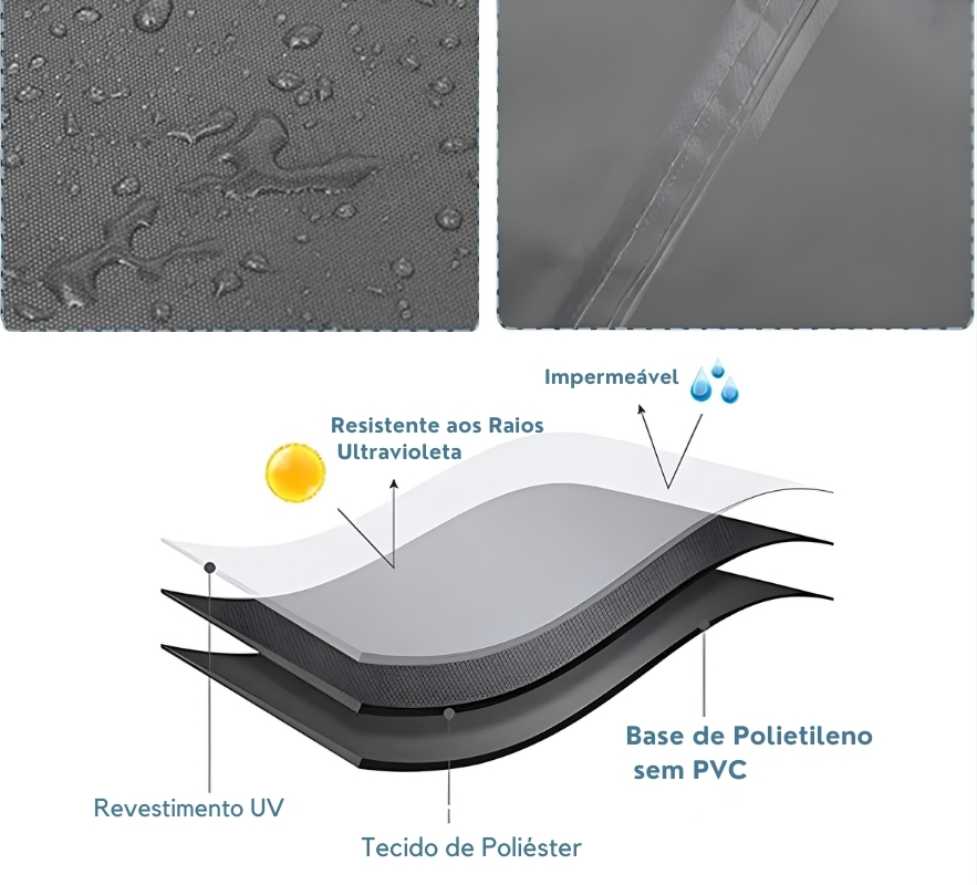 Produzida com Tecido Oxford 210D + revestimento em PVC impermeável + proteção UV, ela cria uma barreira eficiente contra: